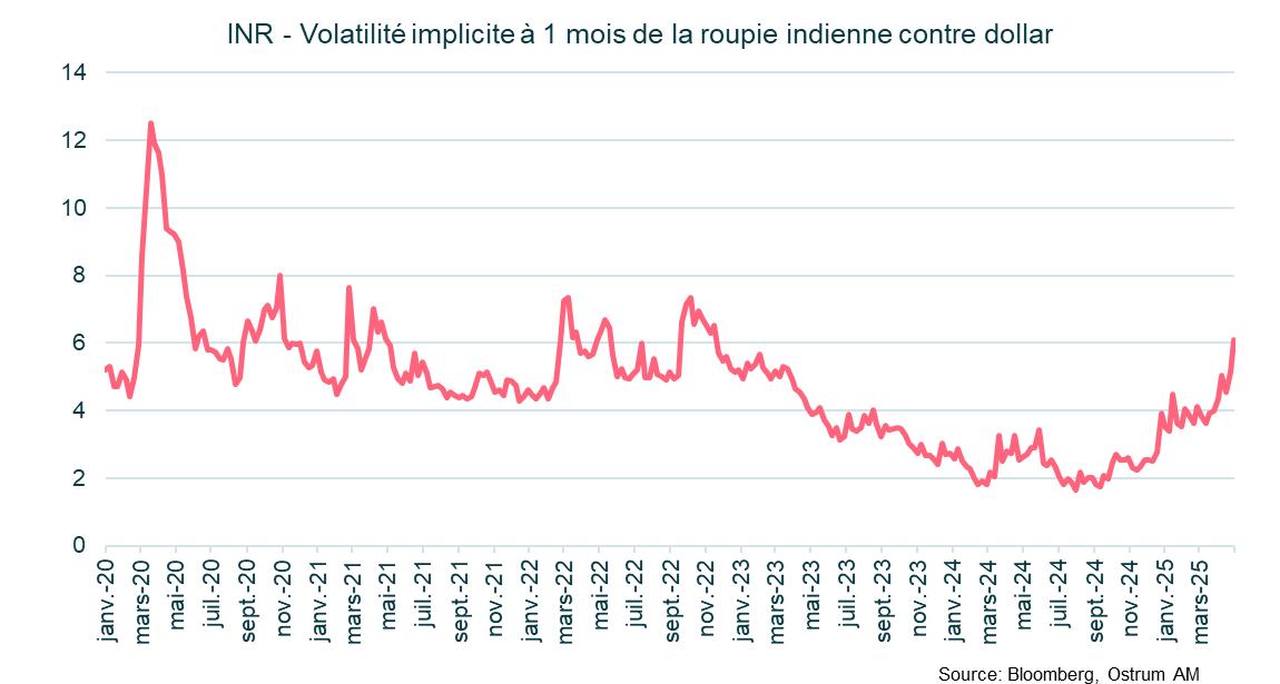 Le déclenchement d'un conflit entre le Pakistan et l'Inde semble avoir ravivé la volatilité du taux de change USD-INR après une période prolongée de volatilité inférieure à la normale. La volatilité implicite à 1 mois est revenue à 6 %, un niveau proche de la moyenne de 2020-2022.